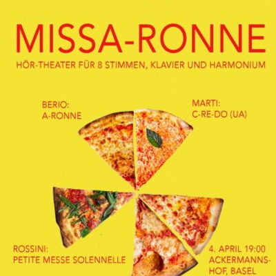 Das Konzert «Missa-Ronne» ist ein szenischer Dialog zwischen Luciano Berios Lautgemälde „aronne“ und Gioachino Rossinis „Petite Messe Solennelle“ – ein Stück das zwischen Messe und Opera buffa schwebt.